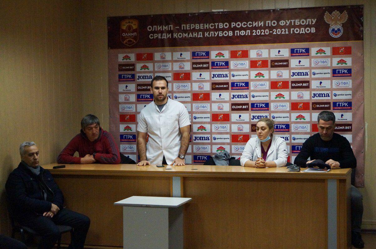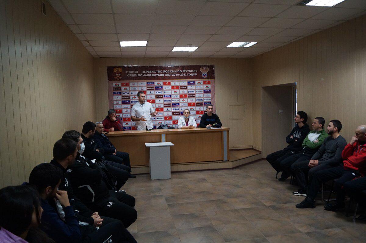 МКУ «СШОР по футболу» (директор — Хамгоков Мурат Асланбиевич) Управления по физической культуре, спорту и делам молодежи Местной администрации городского округа Нальчик организовали встречу с работниками о целесообразности вакцинироваться от Covid-19. Беседу с тренерским составом спортивной школы провели врач МКУ СШОР по футболу – Цагов Мурат и медсестра МКУ СШОР по футболу – Сабалирова Сана.