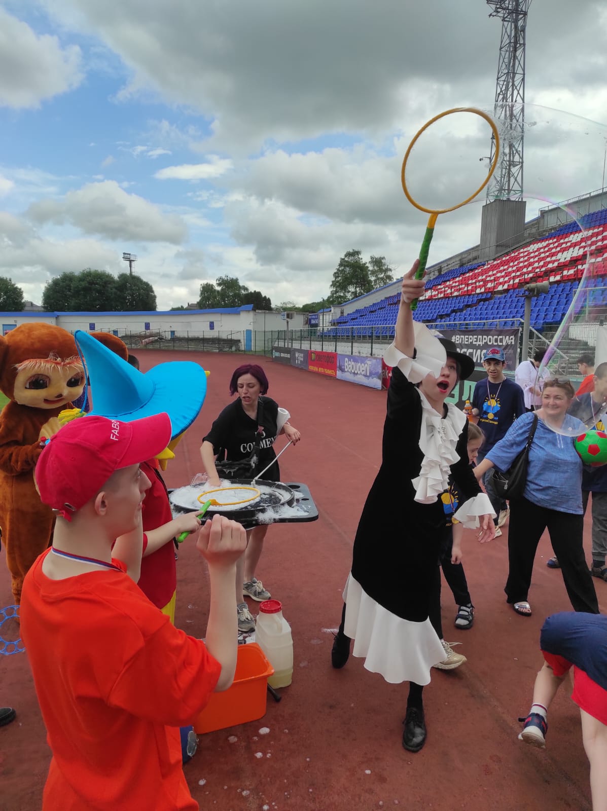 Анимационное агентства «Сова» в очередной раз порадовало ребят танцами и мыльным шоу. После завершения всех участников угостили мороженным и сладкой водой и подарили всем футболки с логотипом мероприятия.